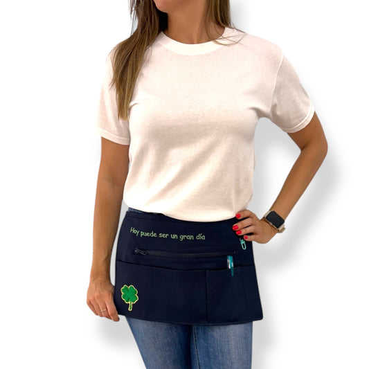 Puedes personalizar tu mandil según tu estilo y personalidad. Elige un diseño de los que están en la web y añade tu toque personal con un texto o frase que te motive. Elige el color del llavero y completa el diseño con un parche divertido. Dispone de cuatro bolsillos de buen tamaño para el móvil, tarjetas, lápices, … aunque si quieres más espacio de almacenamiento puedes añadirle una cremallera que dará acceso a todo el fondo del mandil.