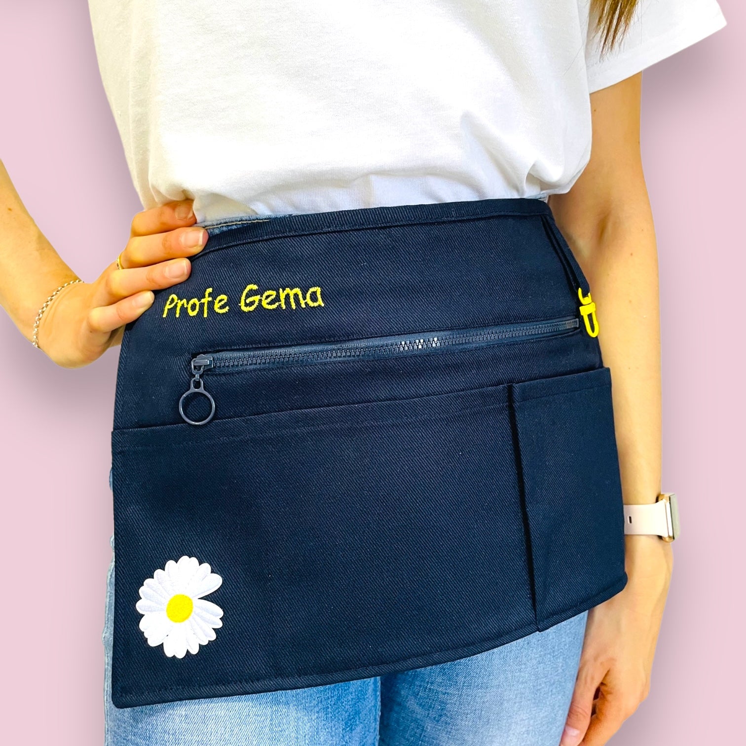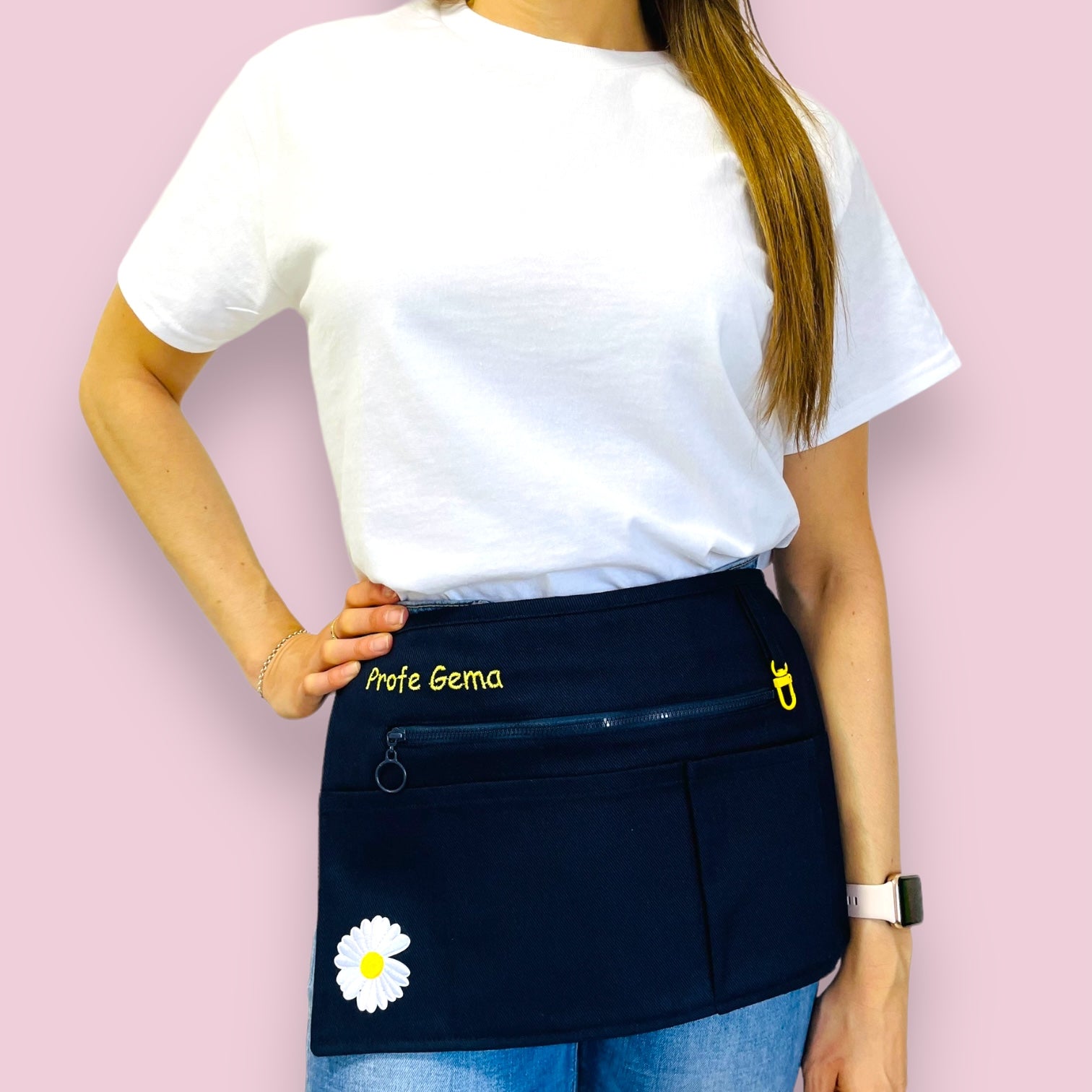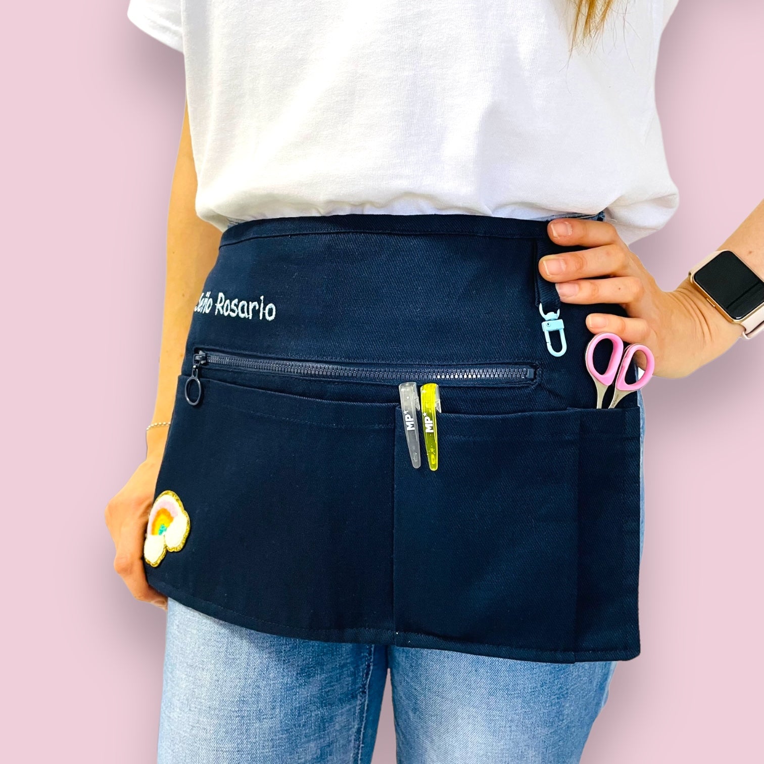 Personaliza tu mandil eligiendo el color del llavero, un parche divertido, también puedes añadirle otro compartimento con cremallera y para finalizar puedes darle un toque muy personal añadiendo un bordado con tu nombre, iniciales o una frase que te motive.