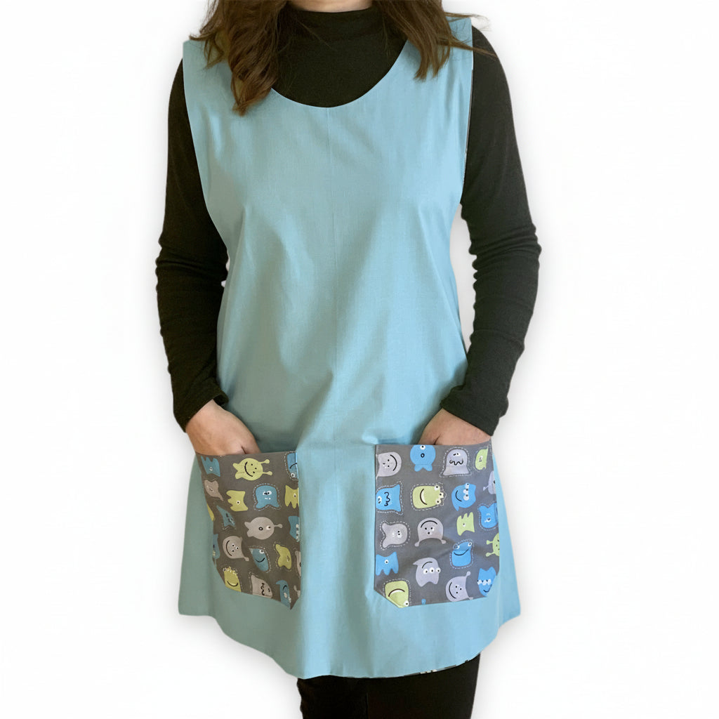 Bata reversível, por isso podes usá‑la do lado liso ou do lado estampado. É como ter ¡duas batas numa!